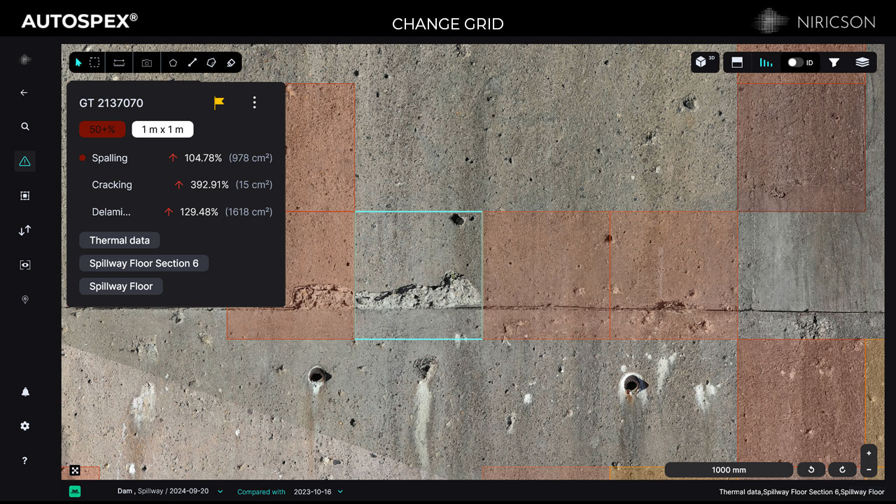 While visual comparison is valuable, decision-making often requires measurable evidence. The AUTOSPEX Change Grid enables users to quantify change across inspections.